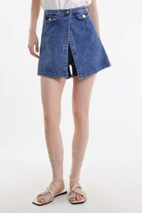 Take your weekend edit to the next level with this denim skort. A high rise waist tops flow shorts with a skort overlay with an opening at the front and decorative flap pockets.