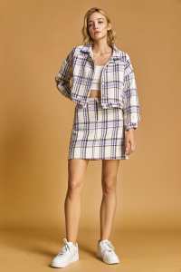 This set features a plaid pattern and a slim fit. It includes a long sleeves jacket with pockets and a high waist skirt. Made of cotton. Perfect for shopping or dating.